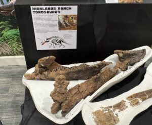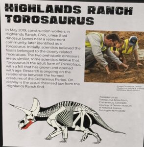 In Spring of 2025, the Aurora History Museum launched an exhibit titled “Prehistoric Aurora,” running until April 2026. This exhibit includes various dinosaurs and plaques describing life in prehistoric Aurora. It features a special section on the Highlands Ranch dinosaurs, where it was revealed that the large triceratops is actually a torosaurus. The exhibit explains that torosaurus might be the adult form of a triceratops. It includes one of the recovered bones, a detailed plaque about the torosaurus, and a photo display where visitors can pose with the triceratops and torosaurus, with a hadrosaur in the background.